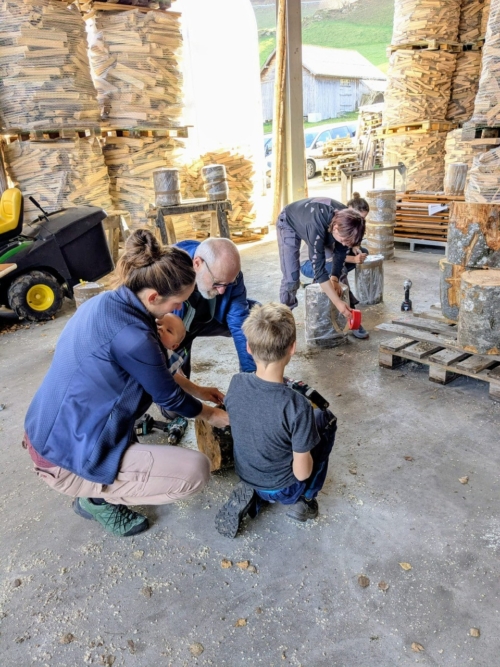 Nach einer theoretischen Einführung in die Welt der Pilze ging es an die Arbeit. Mit Bohrmaschinen wurde Platz in Birkenstrünken geschaffen, in welche mit Pilzsporen präparierte Dübel hineingeschlagen wurden. Nun müssen die Teilnehmenden das Holz richtig lagern, damit sie im kommenden Herbst ihre eigenen Pilze ernten können.